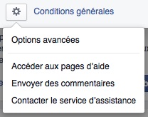 Pour accéder aux réglages avancés offerts par Facebook, cliquons en bas à gauche sur la petite roue crantée (à côté de conditions générales) et sélectionnons « options avancées » comme visible ci-dessous :